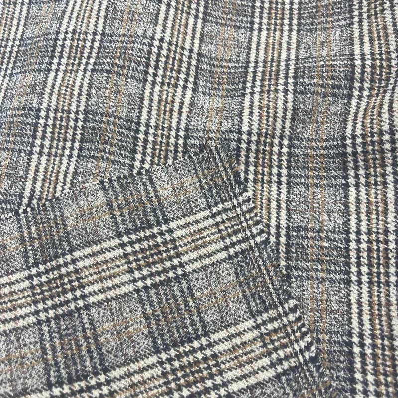 ผ้านี้ ซึ่งกำหนดไว้ในมาตรา 250515 เป็นผ้าทอที่ประกอบด้วยขนสัตว์ 20% โพลีเอสเตอร์ 75% และสแปนเด็กซ์ 5% ด้วยมวลต่อหน่วยพื้นที่ 450 กรัม/ตร.ม. ทำให้มีโครงสร้างที่มีน้ำหนักปานกลางเหมาะสำหรับการตัดเย็บเสื้อผ้า เนื้อผ้าโดดเด่นด้วยลายตารางหมากรุกและลายตารางหมากรุกสีน้ำตาลผสมผสานกัน โดยผสมผสานเส้นด้ายเมทัลลิกเพื่อให้มองเห็นได้ตัดกัน การรวมสแปนเด็กซ์เข้าด้วยกันทำให้สามารถยืดแนวนอนได้ประมาณ 20-25% ในขณะที่ผ้าวูลและโพลีเอสเตอร์ผสมยังคงรักษาเสถียรภาพของโครงสร้าง การผสมผสานระหว่างองค์ประกอบเส้นใยและเทคนิคการทอทำให้เกิดผ้าที่มีความยืดหยุ่นและคำจำกัดความของรูปแบบ ทำให้สามารถนำไปใช้กับเสื้อผ้าที่ตัดเย็บร่วมสมัยซึ่งต้องการทั้งความคล่องตัวและรายละเอียดที่สวยงาม