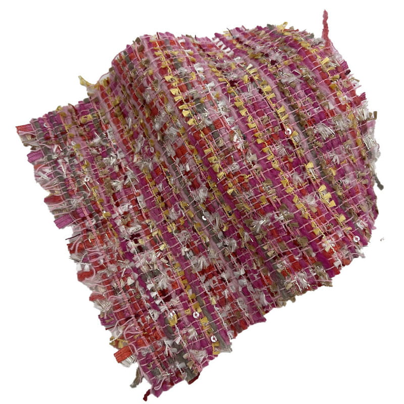 ผ้านี้ตามมาตรา 21003 เป็นผ้าทวีตที่ประกอบด้วยโพลีเอสเตอร์ 67% และอะคริลิค 33% ด้วยมวลต่อหน่วยพื้นที่ 385 แกรม นำเสนอโครงสร้างที่มีน้ำหนักปานกลาง ผ้าประกอบด้วยเลื่อมสีแดงและสีชมพูรวมกับเส้นด้ายโลหะ ซึ่งผสานรวมระหว่างกระบวนการทอผ้าเพื่อสร้างพื้นผิวสะท้อนแสงที่กระจายตัว ฐานโพลีเอสเตอร์ให้ความมั่นคงทางโครงสร้าง ในขณะที่ส่วนประกอบอะคริลิกมีส่วนช่วยให้เนื้อผ้าดูสูงและเท็กซ์เจอร์ การผสมผสานนี้ส่งผลให้ได้วัสดุที่มีการสะท้อนแสงและมิติพื้นผิวที่แตกต่างกัน ลักษณะทางเทคนิคเหล่านี้ทำให้ผ้าทวีตนี้ใช้ได้กับเสื้อผ้าสตรีที่จำเป็นต้องมีองค์ประกอบการตกแต่งและความสมบูรณ์ของโครงสร้าง