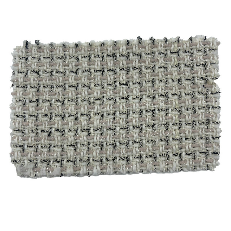 ผ้านี้ตามมาตรา 23523 เป็นผ้าทวีตที่ประกอบด้วยโพลีเอสเตอร์ 78% ขนสัตว์ 12% และผ้าฝ้าย 10% ด้วยมวลต่อหน่วยพื้นที่ 440 แกรม ทำให้มีโครงสร้างที่มีน้ำหนักปานกลางเหมาะสำหรับชุดเดรส ฐานสีชมพูอ่อนมีลวดลายตารางหมากรุกผสมผสานกับเส้นด้ายโลหะในระหว่างกระบวนการทอผ้า การผสมผสานนี้สร้างความแตกต่างทั้งในลักษณะการมองเห็นและการสะท้อนแสง การผสมผสานระหว่างโพลีเอสเตอร์ ขนสัตว์ และผ้าฝ้ายมีส่วนทำให้เนื้อผ้าคงขนาด การควบคุมความร้อน และการจัดการความชื้น ลักษณะทางเทคนิคเหล่านี้ทำให้ผ้าทวีตนี้ใช้ได้กับชุดแฟชั่นที่ต้องการคำจำกัดความของรูปแบบและประสิทธิภาพของวัสดุ
